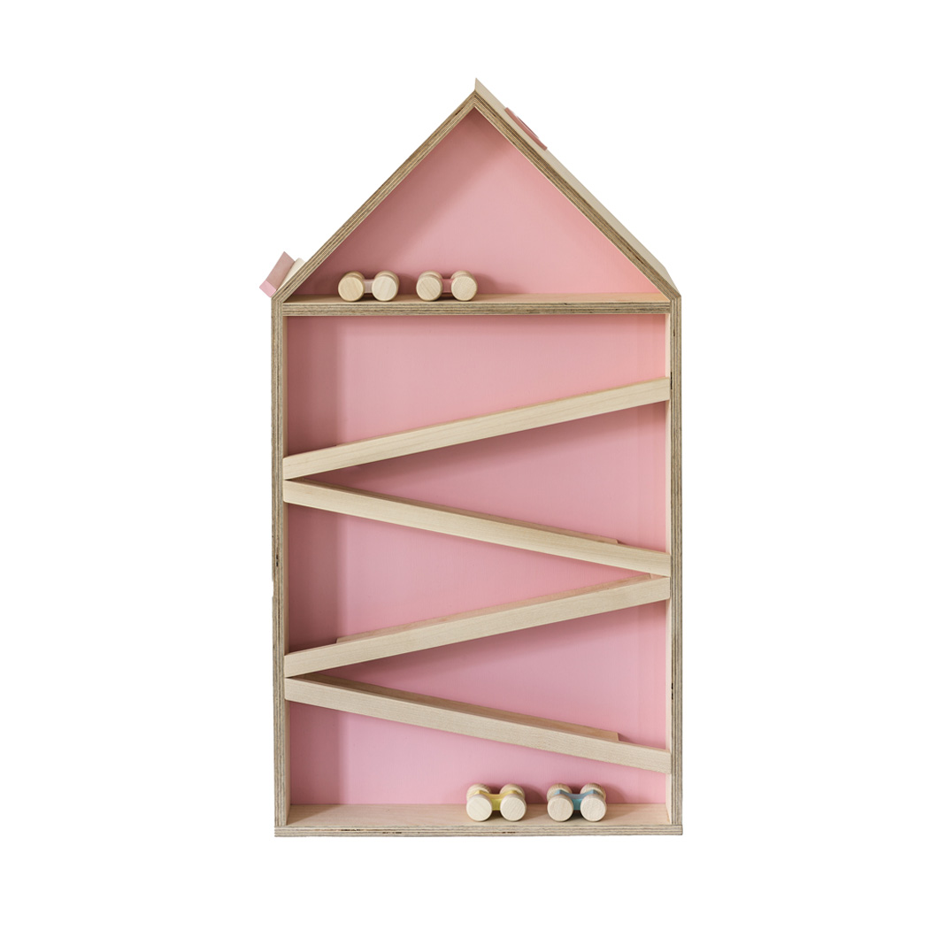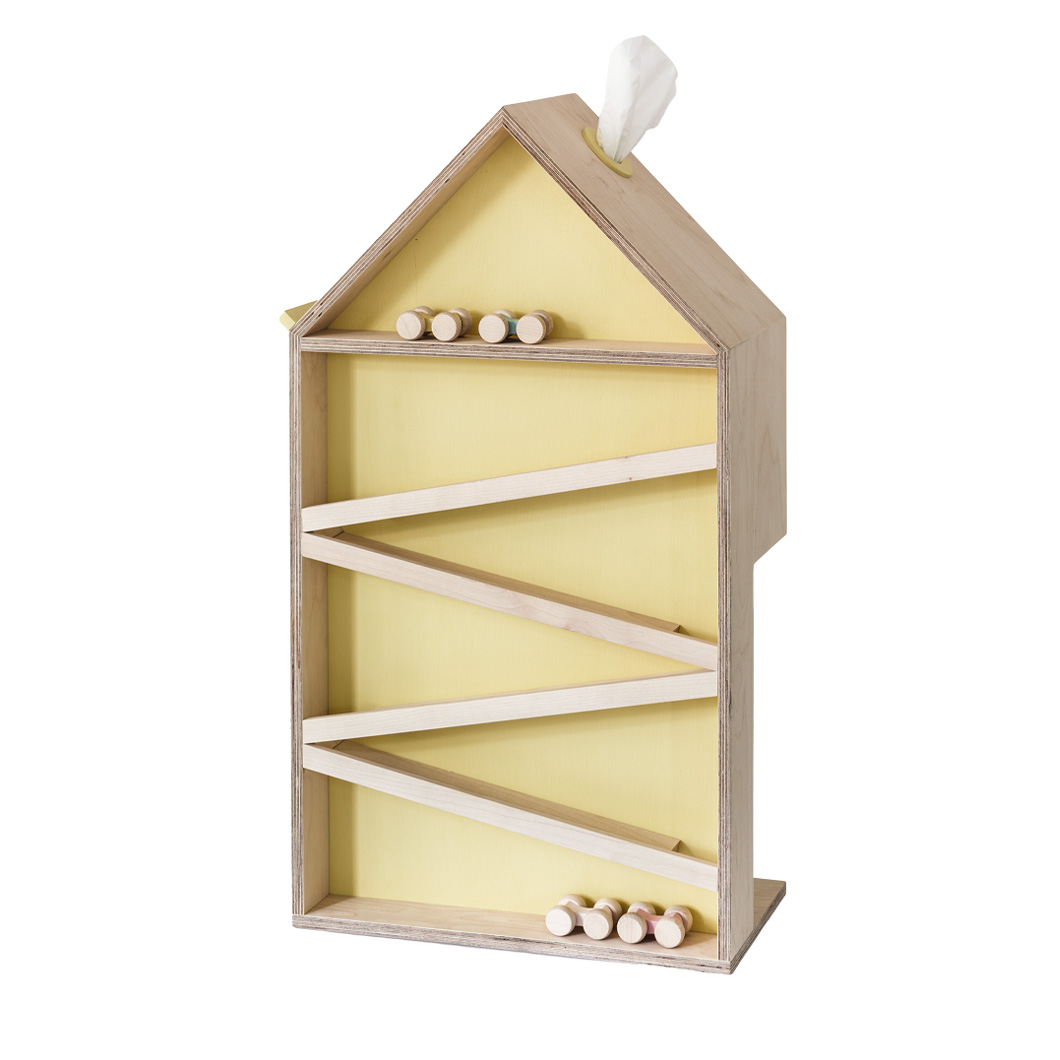 Das vielseitige Möbelstück bietet ein Wechselspiel zwischen Kugelbahn und Kinderregal: 4 Autos rollen an der Front des Hauses über die Schrägen; rückseitig können Bücher, Kuscheltiere oder Fläschchen für die Nacht abgestellt werden, wenn es hängend als Regal oder Nachttisch platziert wird. Für die Laufnase steigt „weißer Rauch“ aus dem Schornstein, denn die Taschentücher sind unter dem Dach versteckt. Auf den Boden gestellt, kann es beidseitig bespielt und die Rückseite z.B. als Spielhaus genutzt werden – der Kreativität der Kinder werden dabei keine Grenzen gesetzt.
